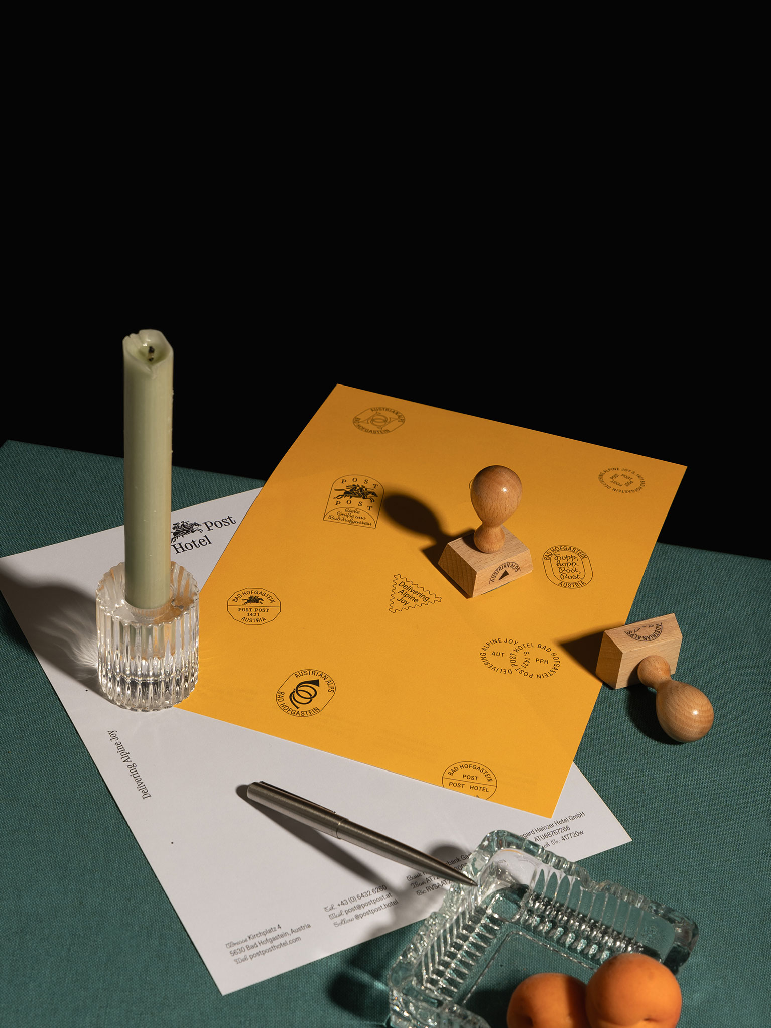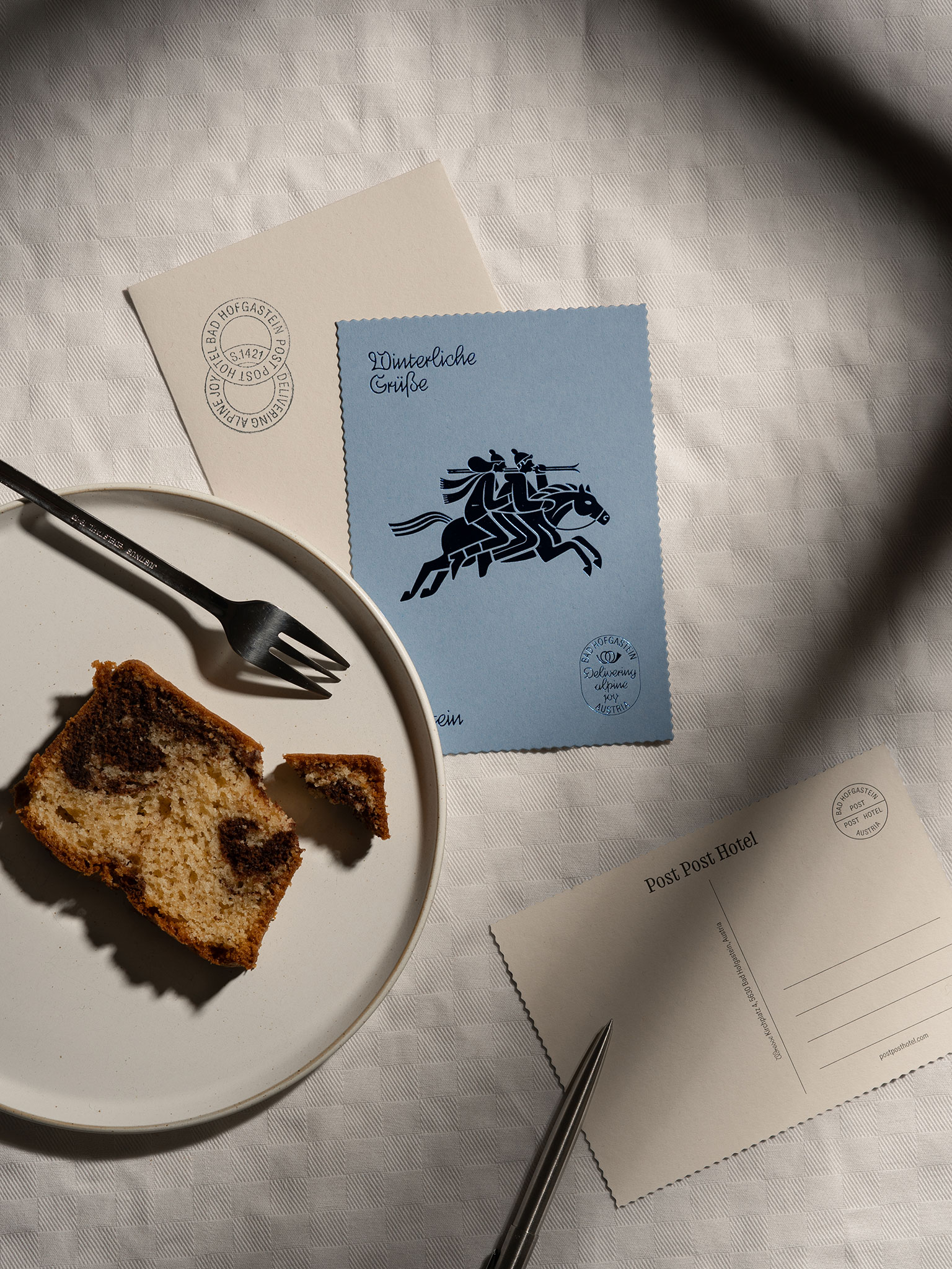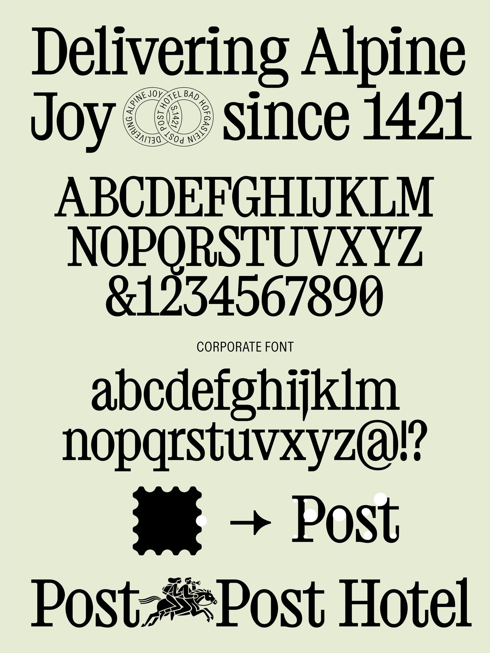 Der spielerische Umgang mit Illustration setzt sich dann im Restaurant dem “Postler” fort. Auch in den weiteren Gestaltungselementen spürt man den Postcharakter mal mehr oder weniger subtil. Der Corporate Font greift die Kontur der Briefmarken auf und ein Set mit zahlreichen Poststempel und Stanzungen schafft eine starke Differenzierung zu allen anderen Post-Hotels in der Nähe oder Ferne.