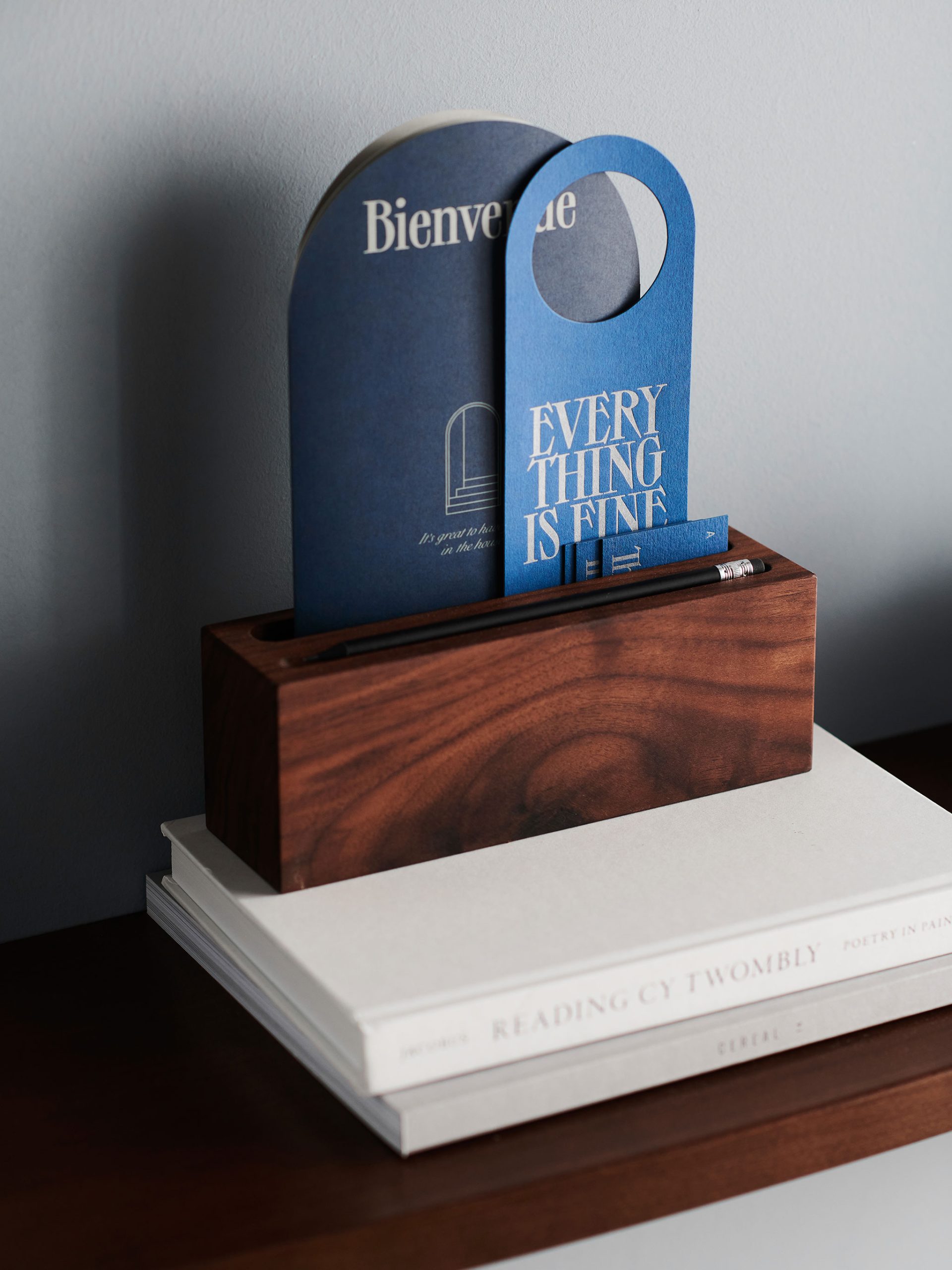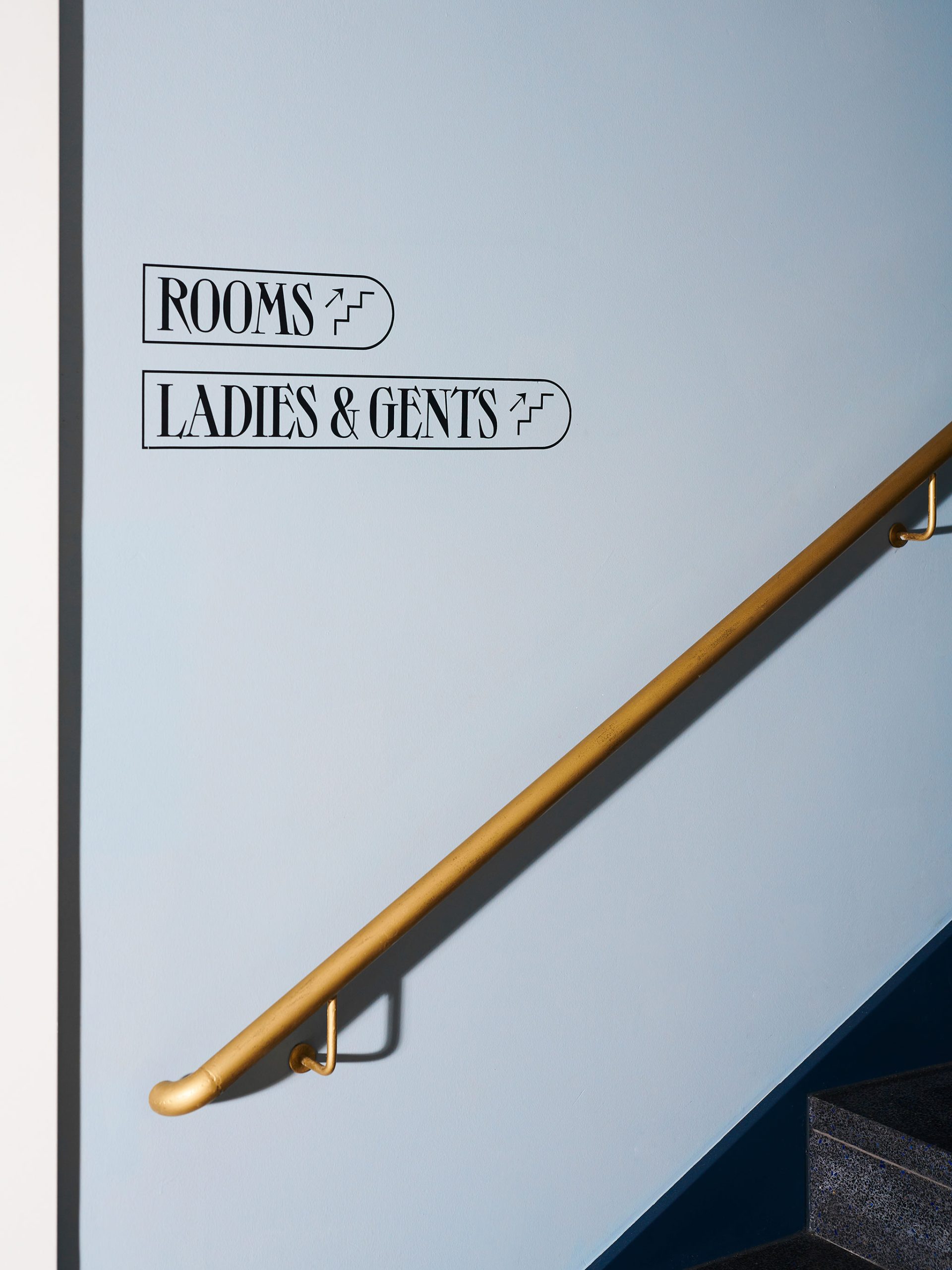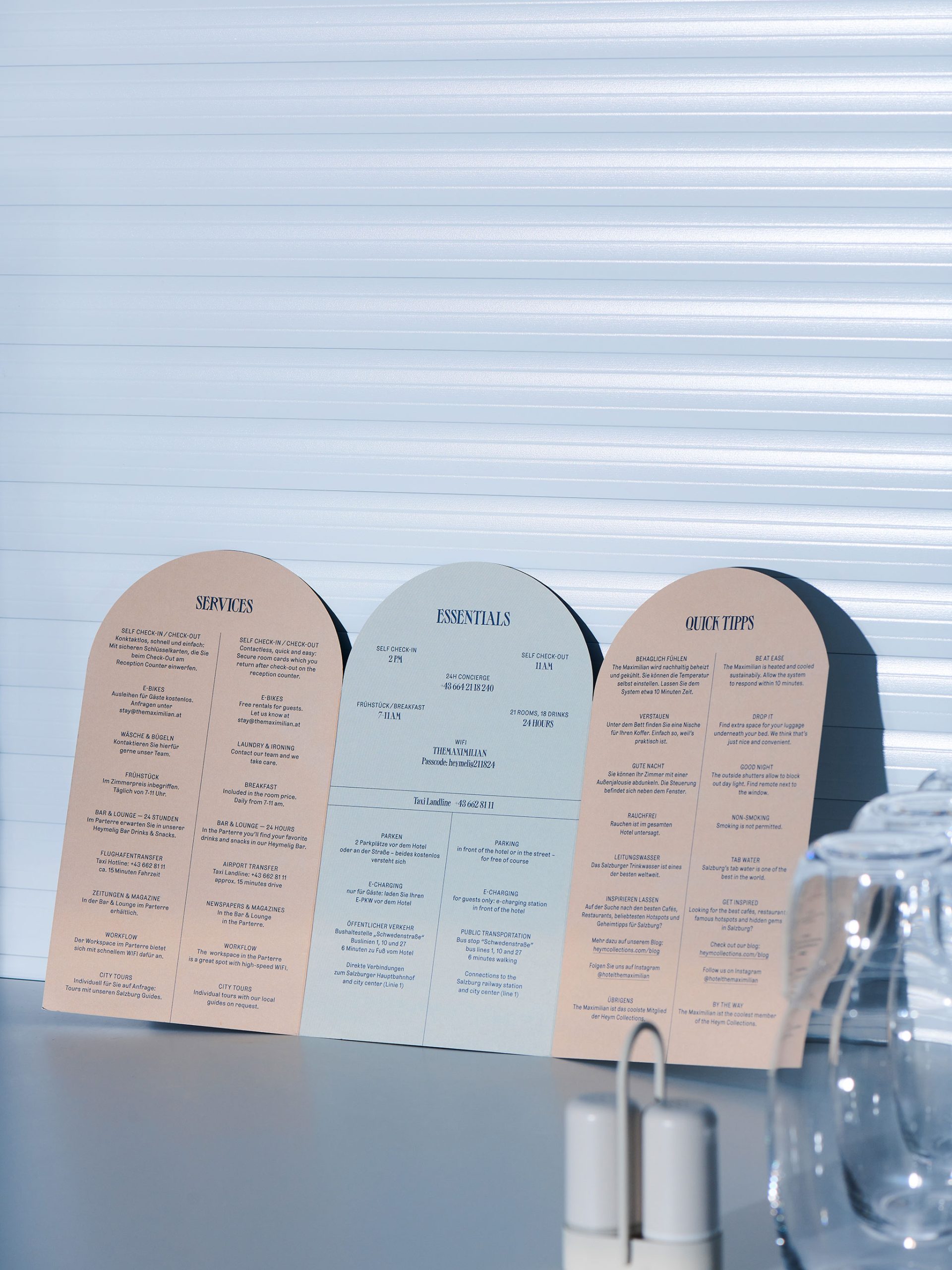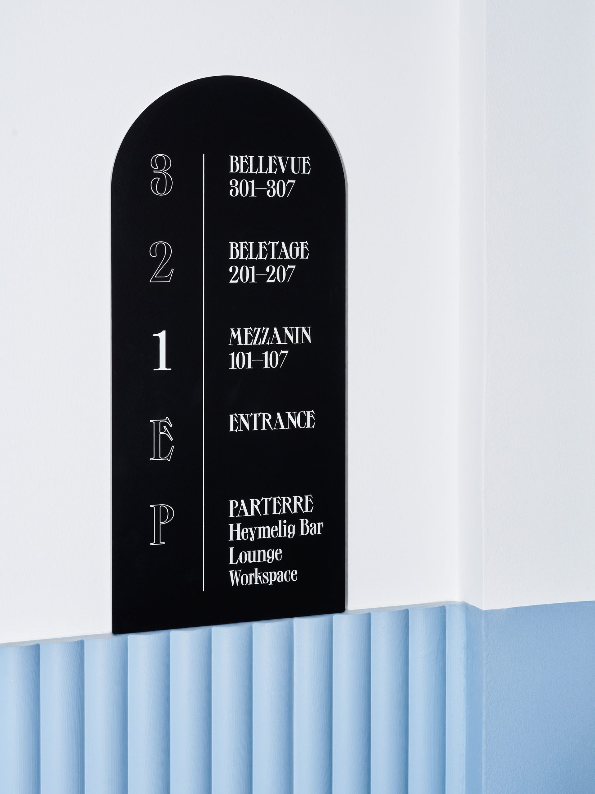 Immer wieder wird diese charakteristische Form mit Fingerspitzengefühl integriert — ob als Wandvertiefung, Möbelform oder Bodenmuster im Orientierungssystem und den Berührungspunkten des Hotels. Grau-, Sand- und Blautöne fügen sich elegant und hochwertig zusammen und geben dem Erscheinungsbild auch in Kombination mit einem modernen Schriftbild eine besondere Note.